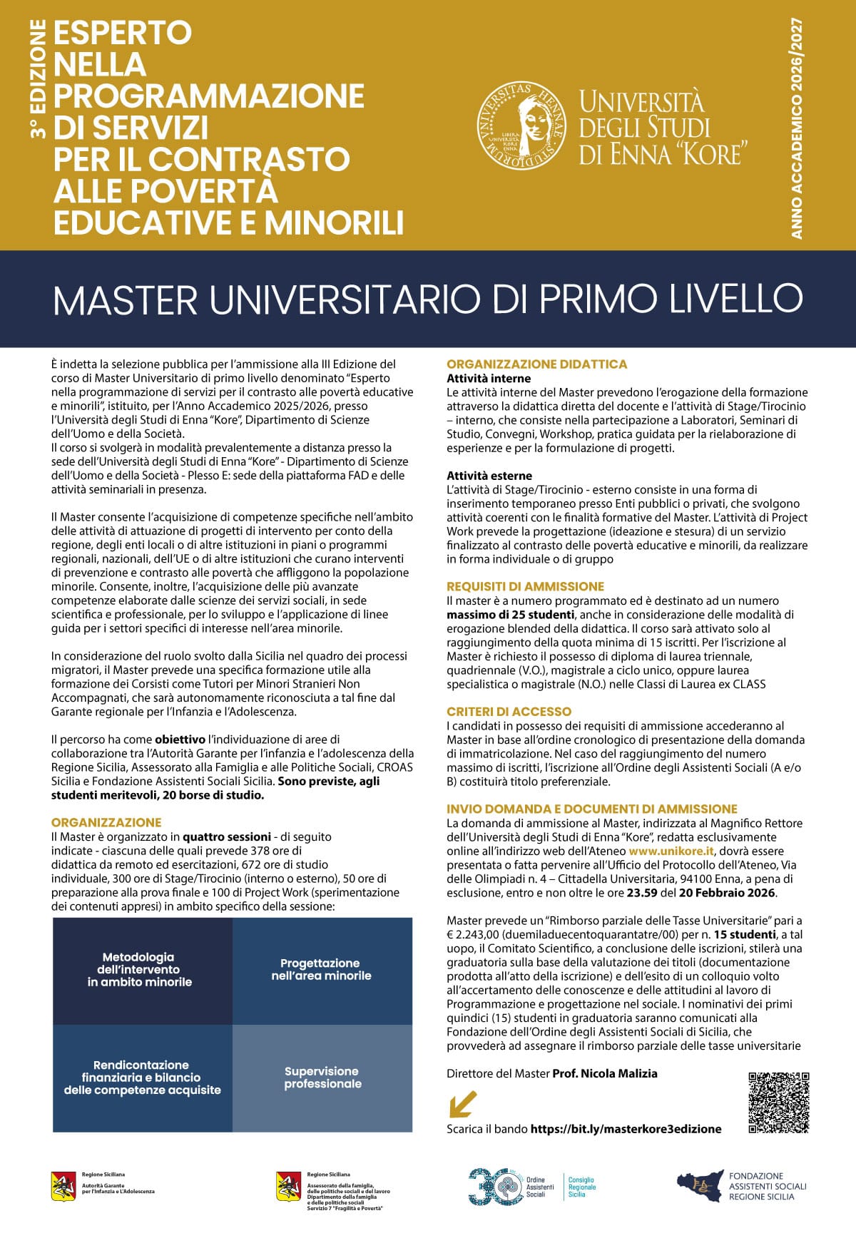 È indetta la selezione pubblica per l’ammissione alla III Edizione del corso di Master Universitario di primo livello denominato “Esperto nella programmazione di servizi per il contrasto alle povertà educative e minorili”, istituito, per l’Anno Accademico 2025/2026, presso l’Università degli Studi di Enna “Kore”, Dipartimento di Scienze dell’Uomo e della Società.